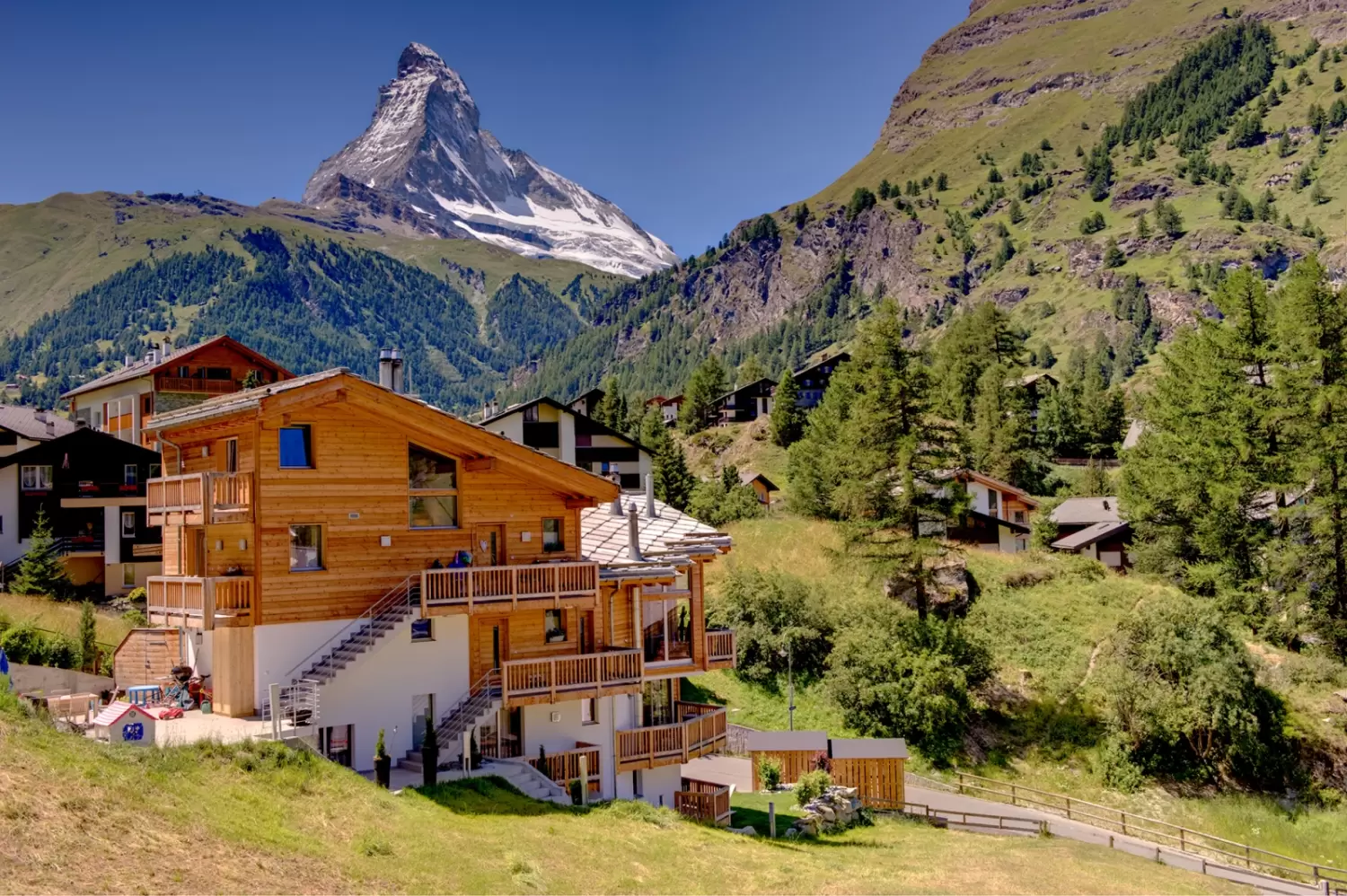 Von den sonnigen Terrassen aus (Nachmittags- und Abendsonne) geniessen Sie die schöne seitliche Matterhornsicht sowie einen einmaligen Blick über das Dorf Zermatt.
